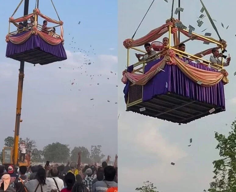 Từ trên cao, người đàn ông bắt đầu rải một lượng lớn tiền mặt xuống đất. Ở phía dưới, những người tham gia thi nhau nhặt những tờ tiền bay từ trên cao xuống.