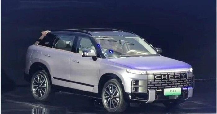 Chiếc Chery TJ-1 đáng quan tâm bởi đây chính là phiên bản "song sinh" với Jaecoo 7 sẽ bán tại Việt Nam cuối năm nay. Nhìn tổng thể, bên ngoài của Chery TJ-1 cứng cáp với kiểu dáng vuông vức. Đáng chú ý nhất là logo Chery lớn được nhúng trên lưới tản nhiệt phía trước màu đen.