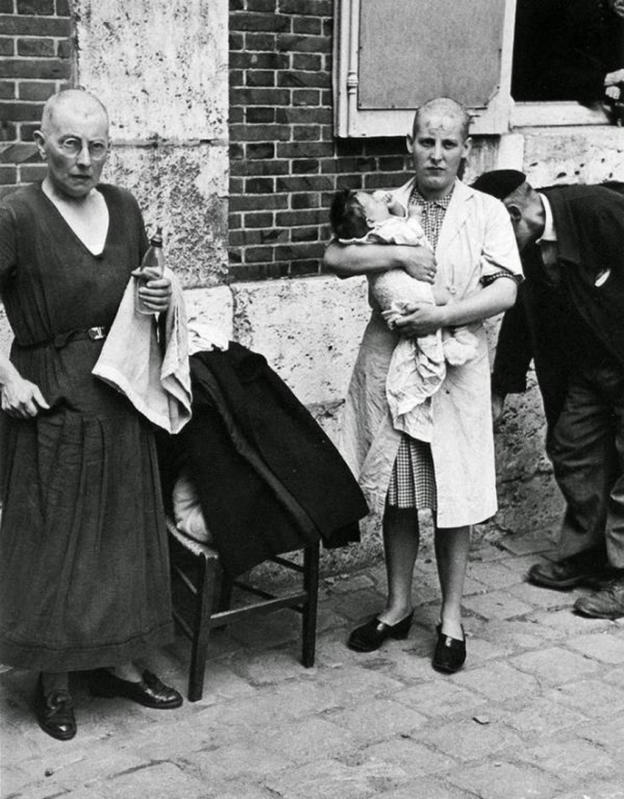 Jack Colville, phóng viên của tạp chí Time đă ghi lại những ǵ ông nh́n thấy hồi tháng 6/1945: "Một chiếc xe tải mui trần chạy qua trước mặt tôi trong tiếng la ó, chửi bới của đám đông người Pháp. Ở thùng xe, có khoảng 30 phụ nữ Pháp đầu cạo trọc, mặt có dấu chữ thập ngoặc Đức Quốc xă viết bằng nhựa đường. Nhiều người trong số đó khóc nức nở, số khác cúi gằm, cam chịu…".