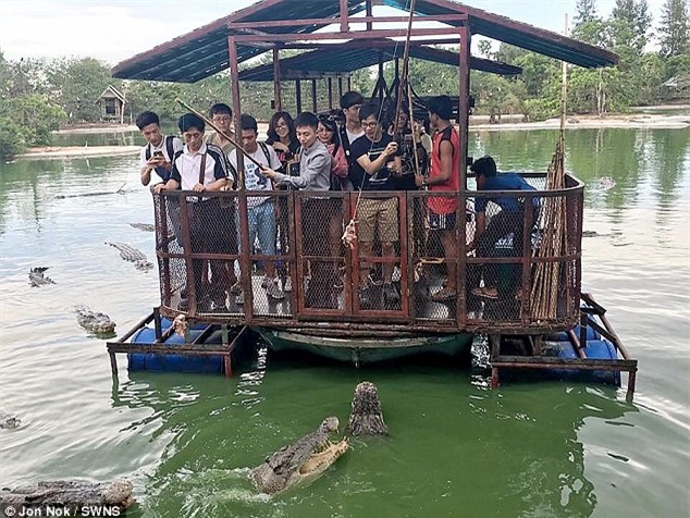 Những du khách Trung Quốc được đưa lên chiếc thuyền có thiết kế mái che và khung giăng lưới mỏng xung quanh bạo gan dùng cần thả thịt cho đàn cá sấu tới ăn.