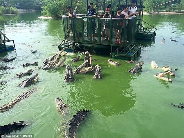 Sợ hãi cảnh khách du lịch cho cá sấu đói ăn thịt. Những con cá sấu đói cỡ lớn nhao lên há miệng đớp mồi rất gần hàng rào mà du khách đứng trên thuyền khiến ai cũng rợn người