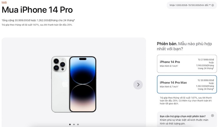 Điều đó có nghĩa, nếu người dùng mua trả góp một chiếc iPhone 14 Pro Max 128GB với giá 30,99 triệu đồng trên Apple Store Online Việt Nam, trả trước 20% theo quy định (khoảng 6,2 triệu đồng) thì tổng tiền lãi phải trả thêm ước tính phải nhiều triệu đồng nữa. Lưu ý: Số tiền lãi thay đổi phụ thuộc vào số tiền gốc khách hàng trả định kỳ.
