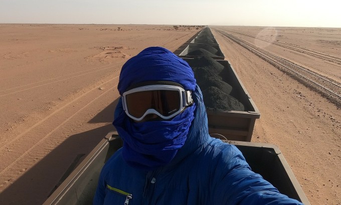 Noah trên một toa chở quặng sắt của con tàu Train du Desert ở Mauritania.