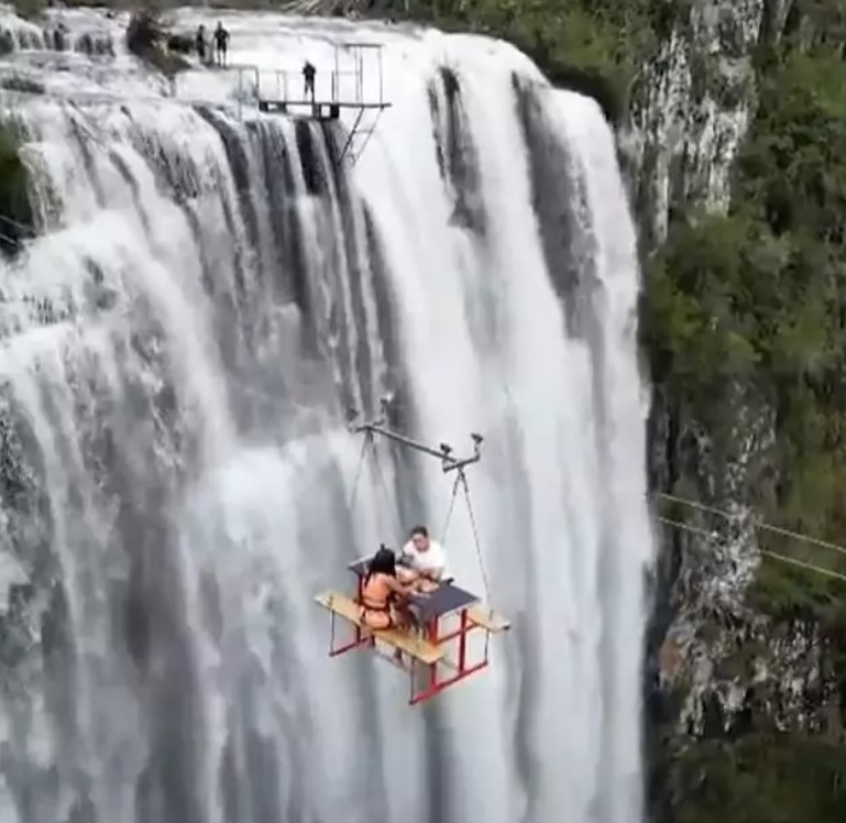 Một cặp vợ chồng người Mỹ đã chia sẻ lại khoảnh khắc khi họ thản nhiên ngồi ăn trên một chiếc bàn ngoài trời treo lơ lửng ở độ cao khoảng 80m ngay trước một thác nước ở Brazil.