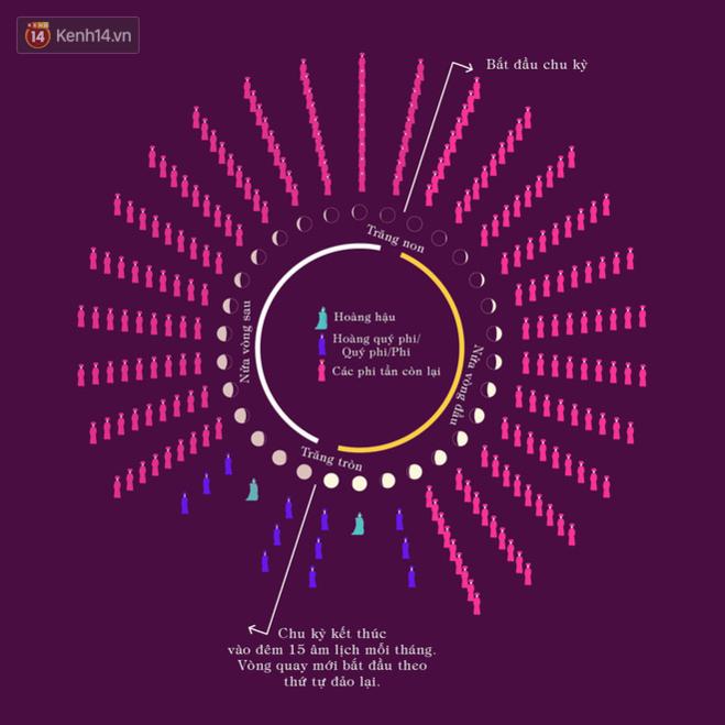 Kết quả là, hoàng hậu hay quư phi sẽ được ưu ái kề bên hoàng thượng vào những đêm trăng sáng. Ngược lại, thời điểm trăng non sẽ dành cho phi tần có thứ bậc thấp hơn.