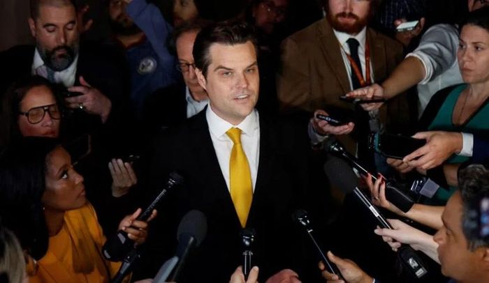 Hạ nghị sĩ đảng Cộng hòa Matt Gaetz trả lời báo chí sau khi nộp kiến nghị bãi nhiệm Chủ tịch Hạ viện Mỹ hôm 2-10. Ảnh: REUTERS