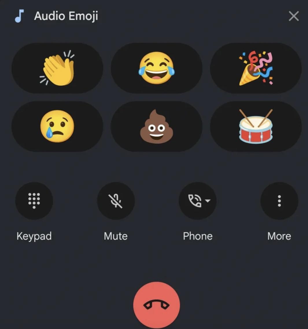 Ứng dụng Google Phone vừa được cập nhật một tính năng thú vị mang tên "Audio Emoji" (Biểu tượng cảm xúc âm thanh). Audio Emoji về cơ bản là các hiệu ứng âm thanh được gắn liền với 6 Emoji khác nhau. Danh sách Audio Emoji bao gồm: vỗ tay, cười, tiệc tùng, khóc, gõ trống và... phân.