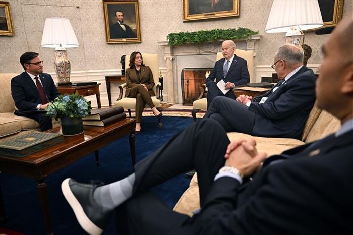 Tổng thống Mỹ Joe Biden (giữa), Phó Tổng thống Kamala Harris (thứ 2, trái) trong cuộc họp với các lãnh đạo Quốc hội ở Nhà Trắng, ngày 27/2/2024. Ảnh: AFP/TTXVN
