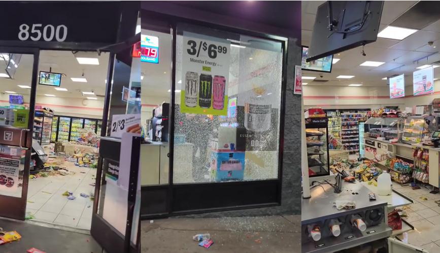 Cửa tiệm 7-Eleven ở Los Angeles bị hàng chục thiếu niên xông vào cướp hàng hóa hôm 9 Tháng Tám, 2024 (Hình: Citizen App)