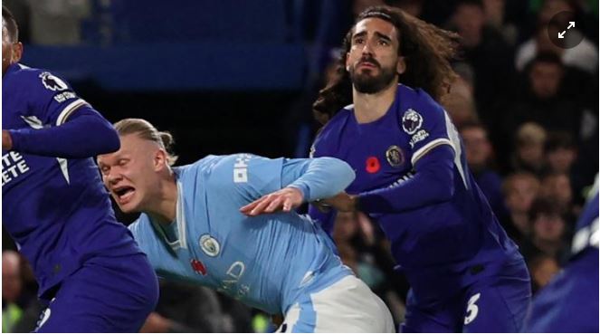 Ở trận Man City thắng Chelsea 2-0, Haaland khiến Cucurella bẽ mặt. Tiền đạo người Na Uy ghi bàn mở tỷ số. Đó là tình huống Cucurella ập vào để ngăn cản trung phong của Man City. Thế nhưng, Haaland phát huy tối đa sức mạnh, khả năng tì đè để sút tung lưới Chelsea.