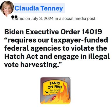 Tenney claimed that Executive Order 14019 "requires our taxpayer-funded federal agencies to violate the Hatch Act and engage in illegal vote harvesting." Her use of the words "requires" and "violate" are not suggestions of what the order could do. They are strong words, but they are wrong.