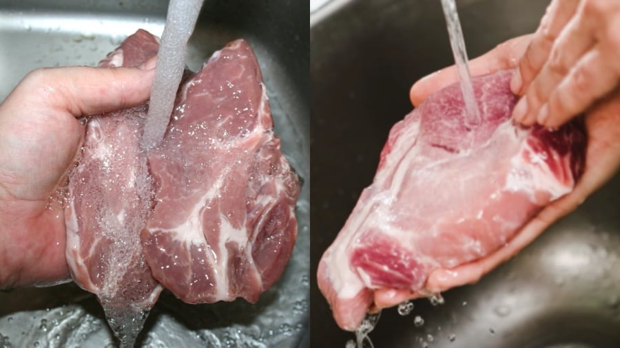 Thịt mua về nên rửa với nước muối loãng để diệt một phần vi khuẩn, loại bỏ các chất bẩn trên bề mặt, khử mùi hôi. Có thể pha thêm chút chanh vào nước. Axit citric và vitamin C trong nước cốt chanh sẽ giúp phá vỡ các sợi liên kết để thịt mềm hơn. Thấm khô miếng thịt trước khi ướp gia vị.
