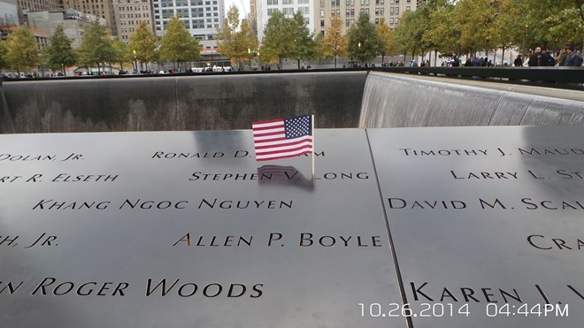 Tên anh Nguyễn Ngọc Khang được khắc trên tấm bia đá bao quanh hồ nước Đài tưởng niệm quốc gia cùng gần 3000 tên các nạn nhân khác trong thảm họa khủng bố kinh hoàng ngày 11/9/2001.