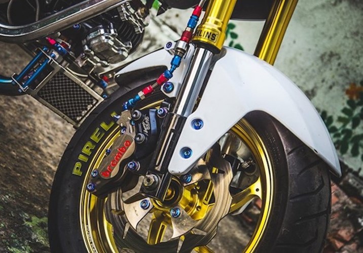 Bắt đầu từ phía trước, đầu đèn nguyên bản của MSX 125 đã bị loại bỏ và thay bằng đèn pha LED tròn vừa cổ điển, vừa hiện đại. "Dàn chân" của xe cũng đã được chủ nhân để mắt với cặp mâm 6 cánh xoắn GP-10 của Over Racing, lốp Pirelli, heo Brembo, đĩa Galfer, dây dầu Earl's và phuộc USD của Ohlins.