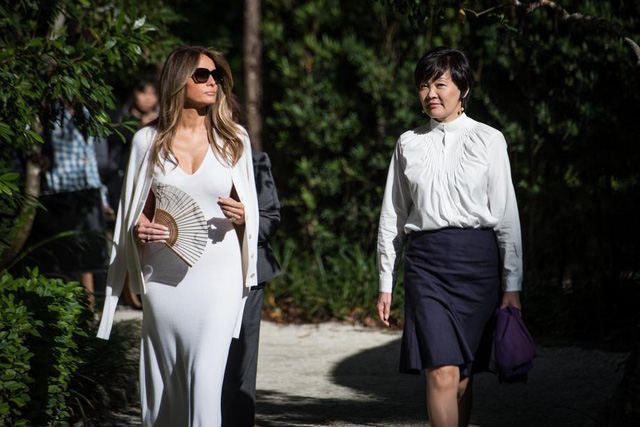 Trong chuyến đi thăm vườn cùng đệ nhất phu nhân Nhật Bản, bà nhận được nhiều khen với chiếc váy trắng có áo khoác kèm theo.