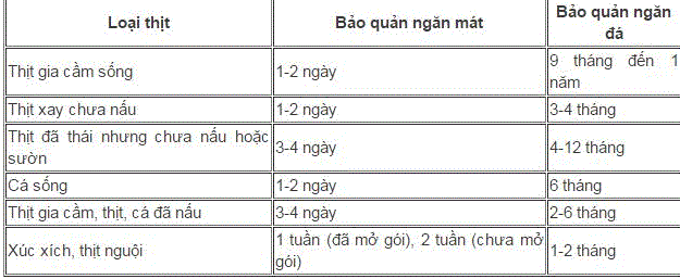 Để tránh các trường hợp ngộ độc do ăn thực phẩm đông lạnh, mọi người cần lưu ý khi bảo quản chúng trong tủ lạnh. Dưới đây là mốc thời gian bảo quản các loại thịt phổ biến:
