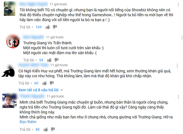 Trên kênh Youtube của chương trình, khán giả cũng phàn nàn: 'Mình chả biết Trường Giang mắc chuyện gì buồn, nhưng bản thân là người công chúng, người ta trả tiền cho Trường Giang ngồi đó. Làm cái thái độ gì vậy?'.