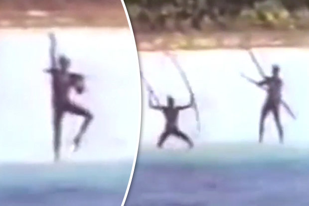 Đoạn video đăng tải trên internet, cho thấy cảnh các thành viên bộ lạc Sentinel đứng bên bờ biển, chăm chú theo dõi người quay phim, với những chiếc giáo sắc nhọn.