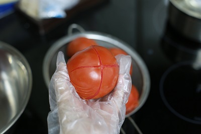 Rửa sạch cà chua, cắt bỏ cuống cà chua. Sau đó dùng dao khía nhẹ hai đường thẳng, vuông góc ở núm cà.