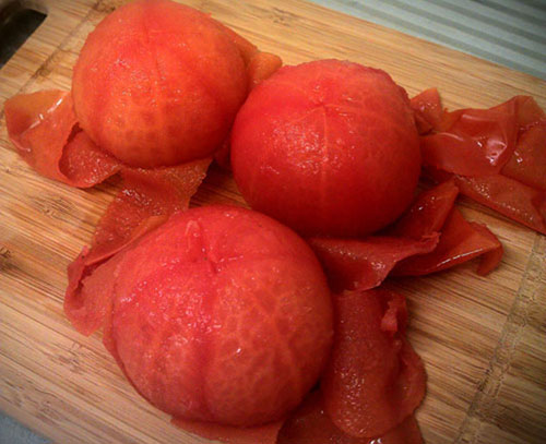 Sau đó dùng muôi thủng múc cà chua bỏ vào tô đá đặt bên cạnh. Khi cà đã được làm mát thì chuyển sang một cái tô khác. Cứ làm như thế cho đến hết cà chua. Sau khi đã chần xong cà thì đổ nước luộc cũng như nước đá đi. Tiến hành lột vỏ cà chua.