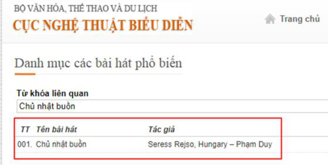 "Chủ nhật buồn" của nhạc sĩ Phạm Duy nằm trong danh mục "Bài hát phổ biến" của Cục NTBD