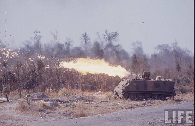 Giống với bom napalm, súng phun lửa cũng là một thứ vũ khí được Mỹ sử dụng rộng rãi trong chiến tranh Việt Nam. Thứ vũ khí này cũng đã bị cấm cùng với bom napalm sau khi chiến tranh Việt Nam kết thúc. Nguồn ảnh: Armchair.