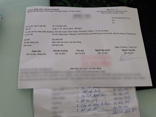 Chưa hết, Phi Thanh Vân còn để lộ bảng chi phí cho lần "đập đi xây lại" nhan sắc này. Nhìn bảng chi phí này sẽ thấy con số cụ thể là hơn nử tỷ đồng. Chính con số chi tiết với mức giá khủng phẫu thuật khủng đã khiến cộng đồng mạng xôn xao truyền tay nhau với nhiều chia sẻ gây hoang mang.