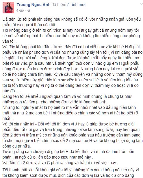 Và đây không phải lần đầu, trước đây đã có bài viết như vậy khi bé H đi giải phẫu về nhằm PR cho đơn vi của họ nhưng cũng lấy tên tôi (vì khi đăng bài họ sẽ giật tít người nổi tiếng). Khi đọc được tôi phải mất mấy ngày tìm hiểu mới biết rõ sự việc phía sau như thế nào và thiết nghĩ thôi đơn vị nào giúp em H giải phẫu cũng được miễn là em được xinh đẹp hơn.
