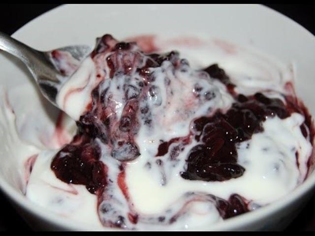 - Bước 3: Múc chè nếp cẩm ra cốc, cho sữa chua và nước cốt dừa vào cốc, cho thêm đá vào và thưởng thức.