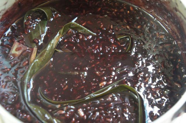 - Bước 2: Nếp cẩm sau khi ngâm đem lên bếp, đun nhỏ lửa. Trong khi đun cho thêm lá nếp vào đun cùng, khuấy đều tay đến khi nếp chính và sánh lại là được. Lưu ý không nên đun quá lâu tránh tình trạng lại gạo. Vì gạo nếp cẩm có lớp vỏ bên ngoài khá dai nên bạn có thể yên tâm sẽ không bị cháy nồi trừ khi bạn để lửa quá to.