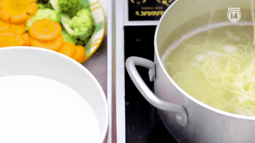 - Đầu tiên các bạn chần mì nước sôi cho sợi mì tơi ra rồi ngâm vào bát nước lạnh.