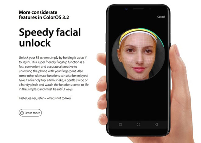 Tính năng mở khóa bằng khuôn mặt của Oppo F5 được đặt tên là Facial Unlock giúp người dùng có khả năng mở khóa dễ dàng bằng nhận diện khuôn mặt. Tuy nhiên, Oppo cũng cho biết tính năng này cũng chưa thực sự hoạt động tốt, và để bảo mật hơn thì mở khóa bằng vân tay vẫn được tích hợp ở mặt sau cùng với hệ thống camera chính.