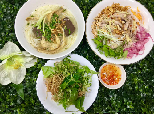 - Để món ăn thơm ngon hơn bạn cần chuẩn bị thêm hành tím bào mỏng, xốc với đường bỏ tủ lạnh 15 phút lấy ra, chế giấm gạo vào, nêm sao ngọt chua vừa miệng. Củ cãi trắng và cà rốt cắt sợi rồi cũng xốc đường, sau đó chế giấm y như trên. Chuẩn bị thêm các loại rau thơm ăn kèm.