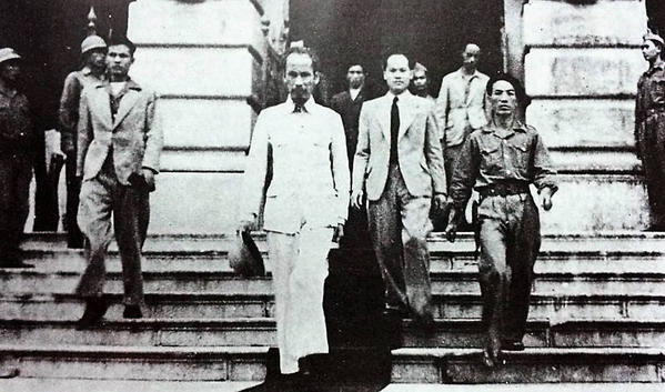 Hồ Chí Minh đi ra từ cổng Nhà Hát Lớn Hà Nội, năm 1946. Người đi ngay sau Hồ Chí Minh, ở giữa là ông Vũ Đình Huỳnh - Đại tá cận vệ, thư ký riêng của Chủ tịch Hồ Chí Minh trong một thời gian dài, sau làm Vụ trưởng Vụ Lễ Tân Bộ Ngoại giao, vụ trưởng trong Ban Kiểm tra Trung ương Đảng.
