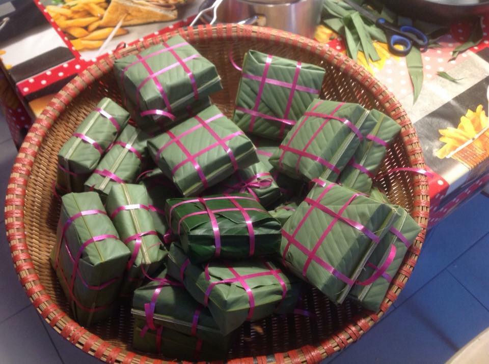Chị Thanh Vân (mặc tạp dề trắng) dạy các bạn trẻ tại Đức cách gói bánh Chưng ngày Tết (ảnh : NVCC)