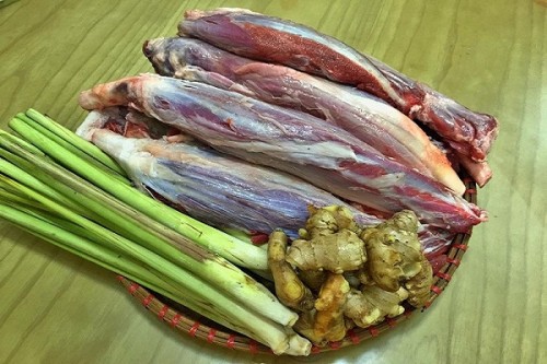 Sả cây đập dập, cắt thành từng khúc cỡ khoảng 3-4cm. Nhánh gừng, cạo sạch vỏ, xắt ra thành từng lát mỏng.