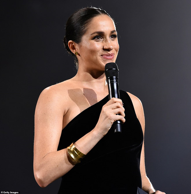 Vợ Hoàng tử Harry diện bộ đầm đen lệch vai thanh lịch, xuất hiện rạng rỡ trên sân khấu. Thiết kế ôm dáng khiến Meghan Markle lộ rõ bụng bầu. Công nương xứ Sussex chia sẻ: "Chắc hẳn mọi người trong khán phòng này đều biết rằng chúng ta luôn có sự kết nối sâu sắc với trang phục chúng ta mặc. Đôi khi nó dựa trên cảm xúc hoặc sở thích cá nhân. Đối với tôi, đó còn là sự gắn kết những phụ nữ với nhau, là sức mạnh".
