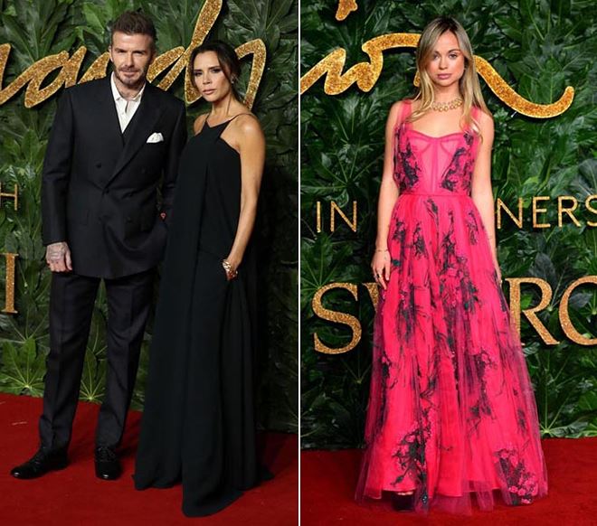 Nhà Beckhams (trái) và tiểu thư Amelia Windsor tại sự kiện thời trang tối qua