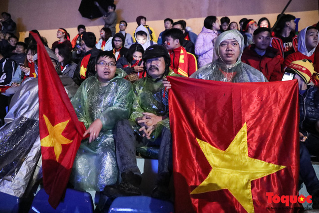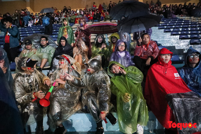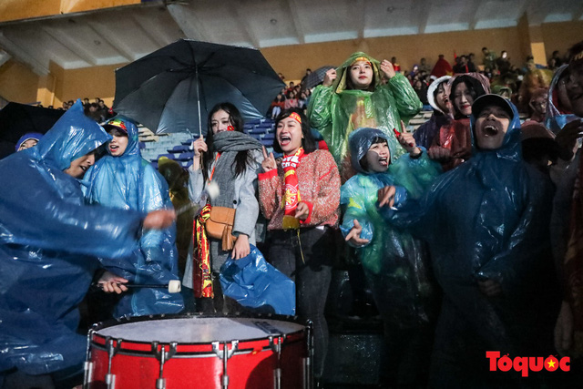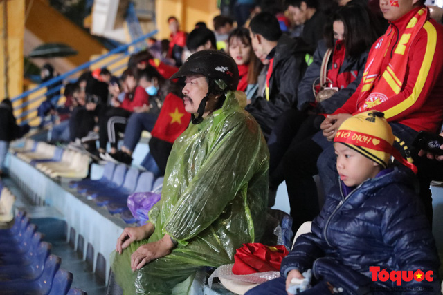 Bất chấp thời tiết mưa rét, nhiều CĐV vẫn che ô, mặc áo mưa để theo dõi, cổ vũ cho ĐT Việt Nam