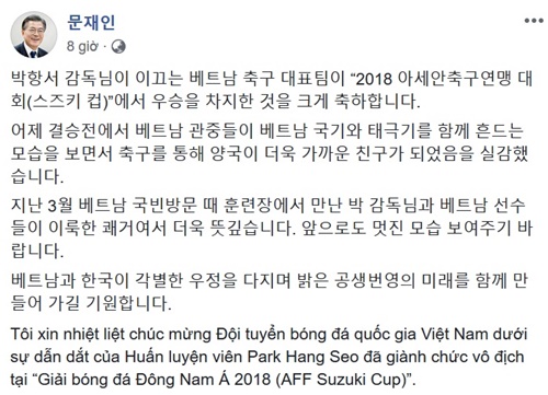 "Tôi xin nhiệt liệt chúc mừng Đội tuyển bóng đá quốc gia Việt Nam dưới sự dẫn dắt của Huấn luyện viên Park Hang Seo đã giành chức vô địch tại Giải bóng đá Đông Nam Á 2018 (AFF Suzuki Cup)", Tổng thống Hàn Quốc Moon Jae-in hôm nay viết trên Facebook bằng tiếng Việt.