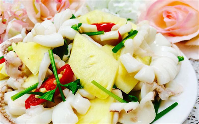 Nguyên liệu: 2 con mực ống + 1/2 quả dứa + 1 qả cà chua + cần tây + tỏi tây + hành khô + tỏi.