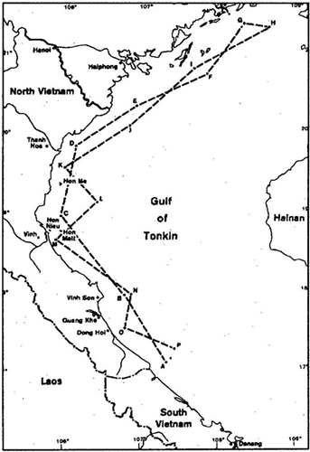 Sơ đồ đường đi của các tàu chiến Mỹ trong chiến dịch DESOTO. Rõ ràng đây là hành động xâm hại lãnh hải, chủ quyền trên biển của Việt Nam trước khi Mỹ tuyên bố tham chiến ở Việt Nam. Nguồn ảnh: Warhistory.