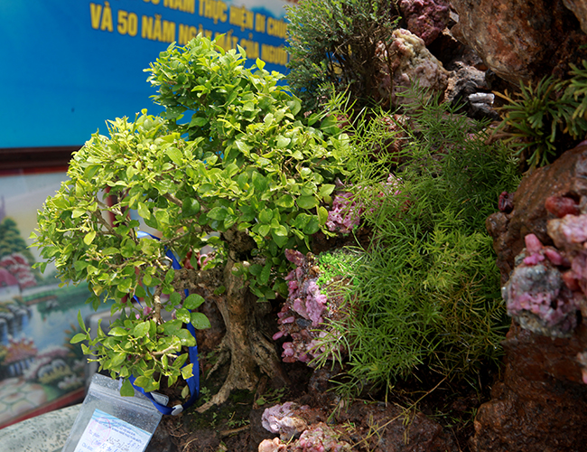 Trên mỗi ngọn núi chủ nhân gắn những cây nhỏ sao cho phù hợp với kích thước hòn non bộ