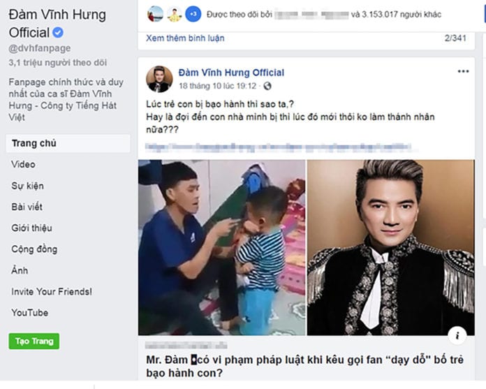 Ảnh chụp từ fanpage chính thức của Đàm Vĩnh Hưng (có dấu tick xanh) cho thấy ca sĩ này thừa nhận việc kêu gọi người hâm mộ “dạy dỗ” người cha bạo hành con. (Hình: Tuổi Trẻ)