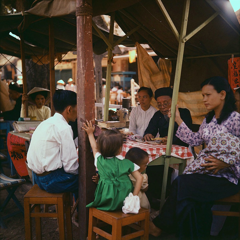 Thầy bói xem bói/ giải quẻ xăm cho khách hàng phía trước lăng Ông trong dịp Tết, Sài Gòn thập niên 1960.
