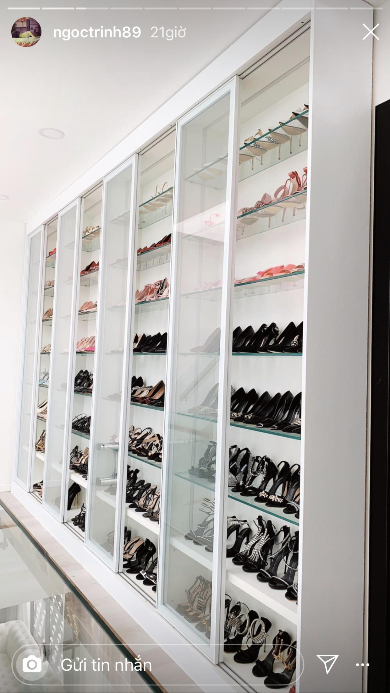 Mới đây, Ngọc Trinh thu hút sự quan tâm của dân mạng khi đăng ảnh chụp cùng tủ giày hiệu cực "khủng" được người đẹp bổ sung thêm trong biệt thự 50 tỷ đồng. Trong ảnh, "Nữ hoàng nội y" diện đồ gợi cảm đứng cạnh tủ giày cao kịch trần nhà. Ngắm tủ giày mới của Ngọc Trinh, dân mạng không khỏi choáng ngợp. Nhiều người nhận xét khu vực để giày của Ngọc Trinh sang trọng, quy mô không thua kém những khu mua sắm giày hiệu cao cấp.
