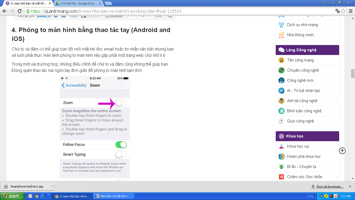 Đối với các chữ trên các trang web: Bạn có thể dùng hai đầu ngón tay để kéo phóng to cỡ chứ lên. Còn chữ trên các văn bản thuộc phần mềm điện thoại như: tin nhắn, email, tên, số thứ tự trong ứng dụng liên lạc…iPhone và điện thoại Android có thể tăng kích cỡ lên bằng cách: