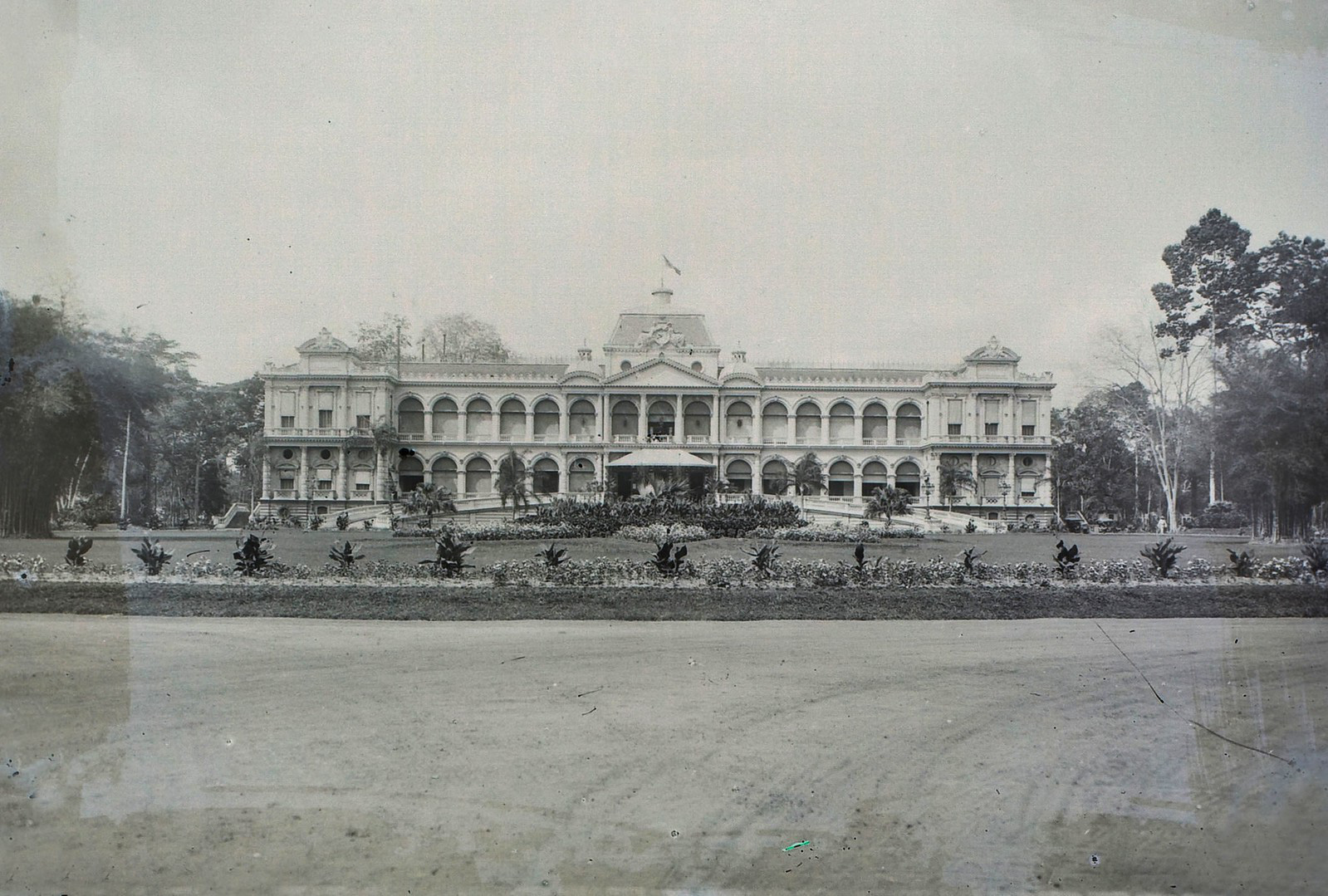 Toàn cảnh Dinh Norodom thập niên 1920, góc nhìn chính diện từ sau cổng chính. Dinh là nơi làm việc của Thống đốc Nam Kỳ (1871-1887), Toàn quyền Đông Dương (1887-1906) và các cơ quan thuộc Phù Toàn quyền (1906-1945).