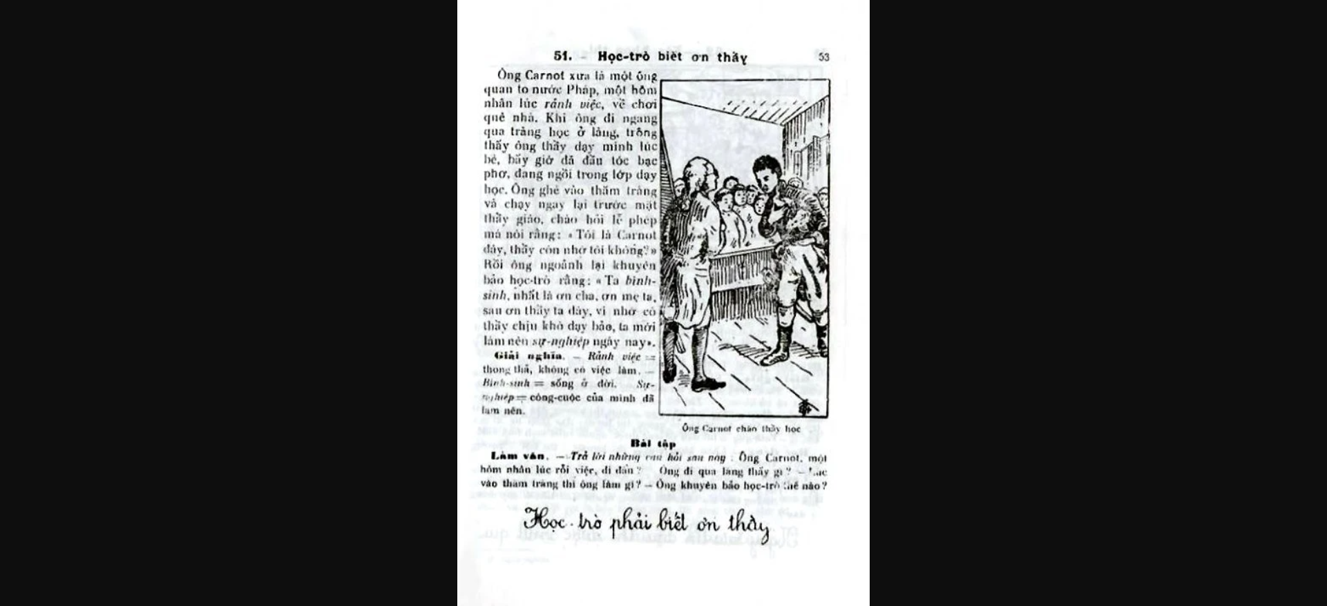 (1) Chuyện ông Carnot nhan đề Học tṛ biết ơn thầy, trong sách Quốc Văn Giáo Khoa Thư (Sách tập đọc và tập viết) Lớp Dự bị do Trần Trọng Kim, Nguyễn Văn Ngọc, Đặng Đ́nh Phúc, Đỗ Thận biên soạn. Nha Học chính Đông Pháp xuất bản (1935).