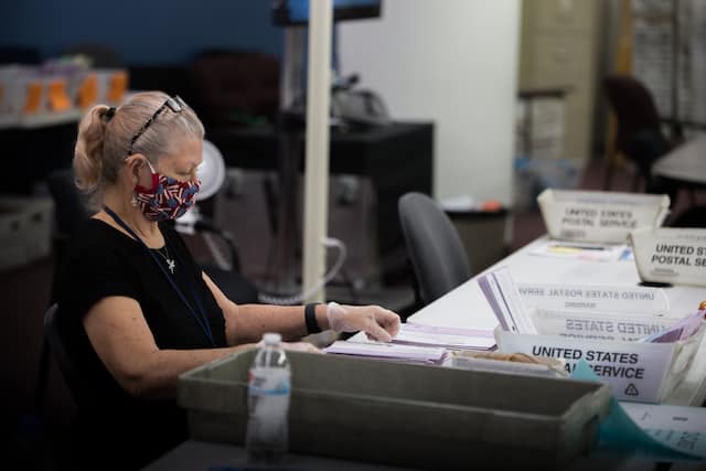 (Ảnh -1) Nhân viên phòng phiếu bầu cử trong ngày bầu cử sơ bộ năm 2020 ở Nevada ngày 9/6/2020. (Ảnh: Trevor Bexon / Shutterstock).